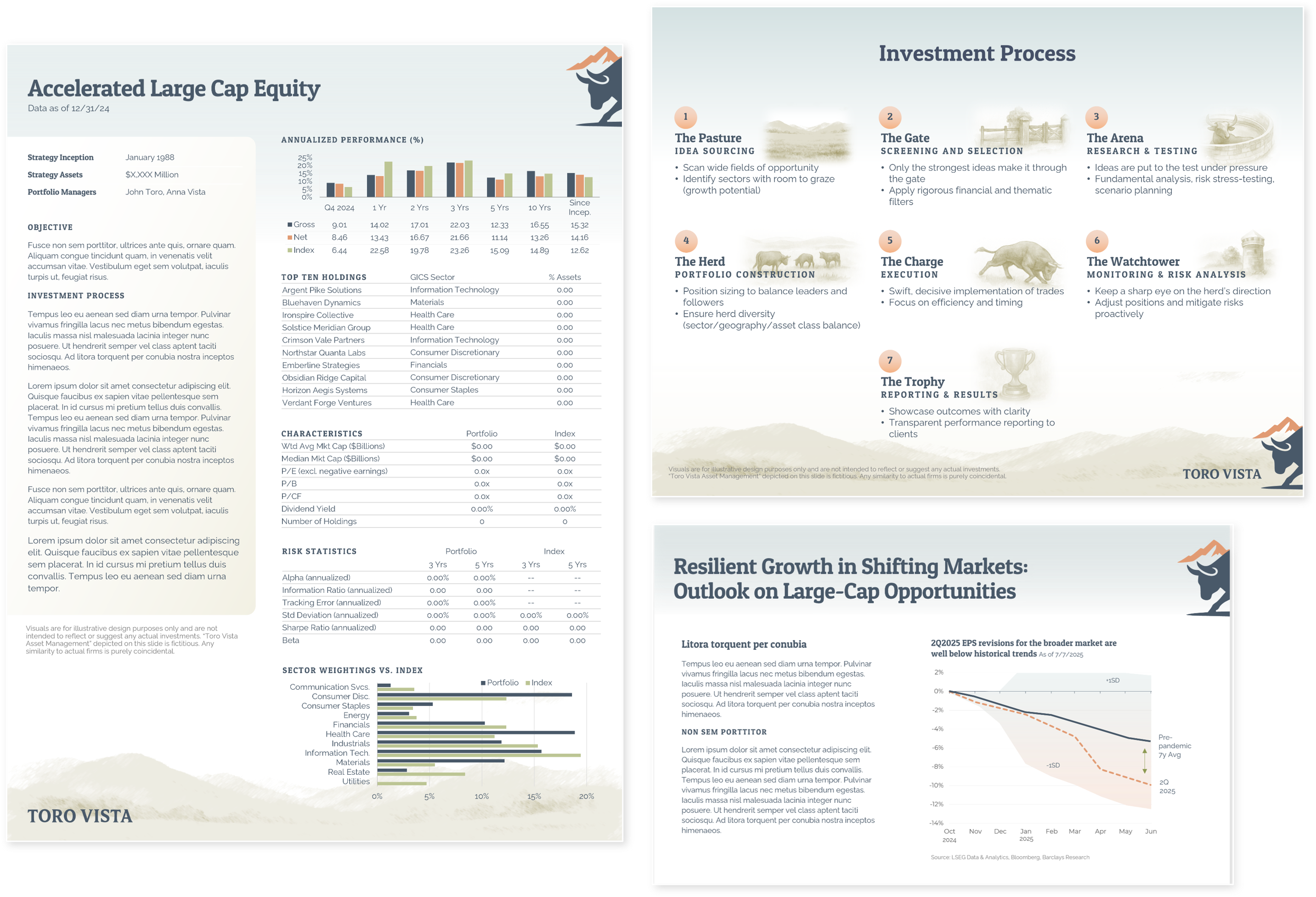 Following the successful transformation of their client reporting, we extended the same automation approach to their marketing materials, including pitchbooks and fact sheets.